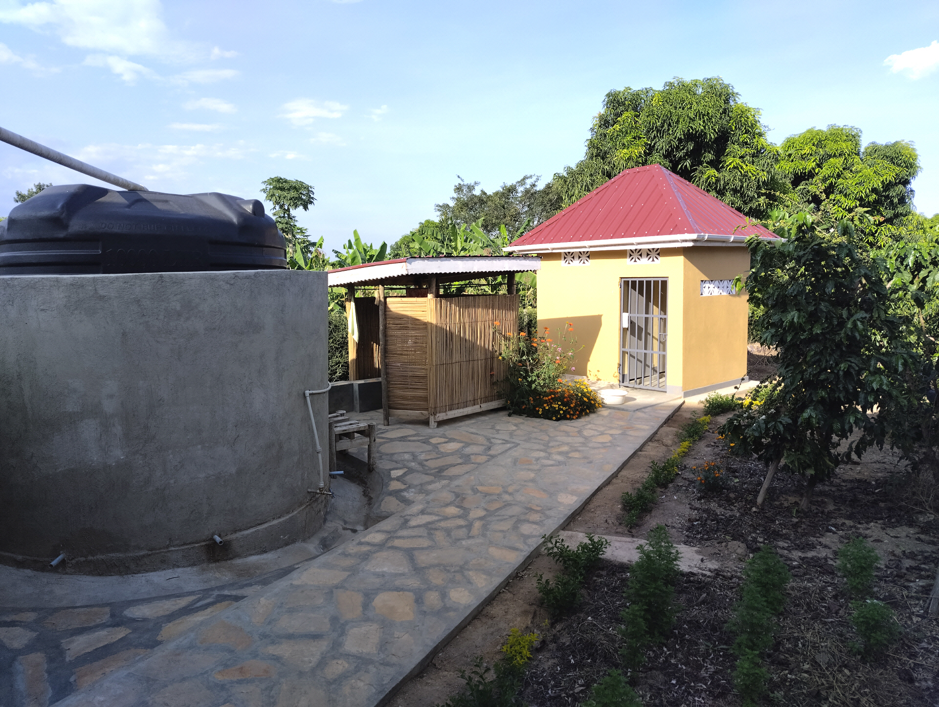 Für die Körperpflege unter freiem Himmel ist der Regenwassertank zuständig und ein separates, sauberes Gäste Plumpsklo.