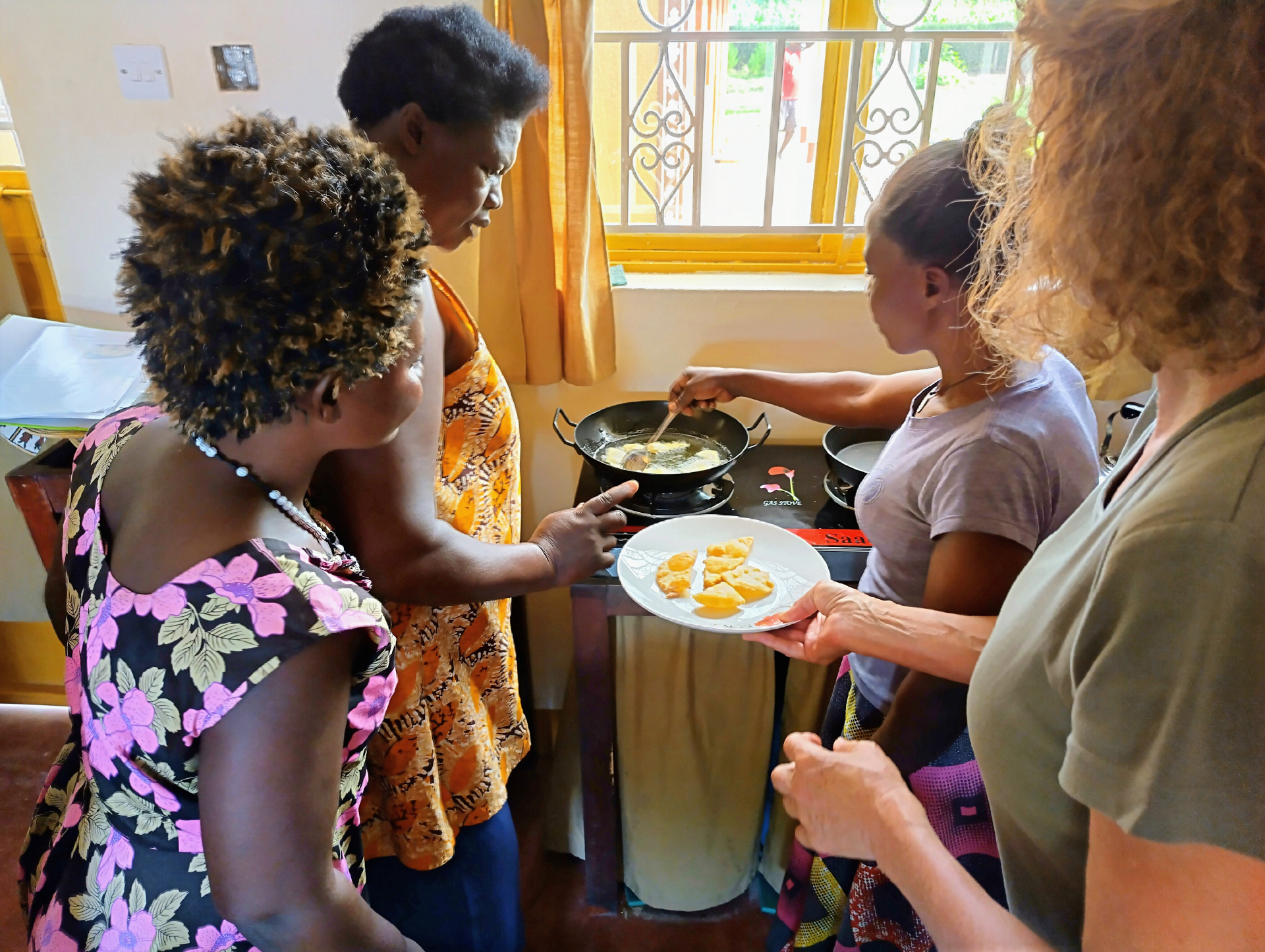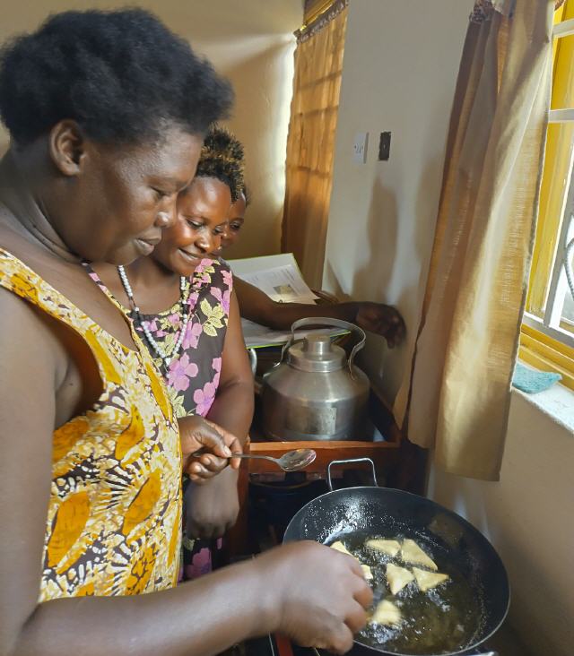 Wir zeigen unseren Projektfrauen neue Rezepte, die sie zubereiten können. Die neuen Kochideen bringt sie zum Staunen und Lachen.